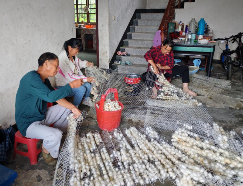 农户采摘蚕茧 6月10日,来榜镇关河村、马元村等迎来首批蚕茧丰收。收购点前,蚕农们载着雪白蚕茧排队等候,现场登记、检验、称重有序进行,欢声笑语中洋溢着丰收的喜悦。 “这季春蚕养了3张蚕种,收入1万多元呢,第二季准备再多看一张,卖更多的钱。”关河村蚕农扬着手中的结算单,脸上洋溢着丰收的喜悦。从共育室领回小蚕后,经过20多天的悉心照料,这些小小的蚕宝宝终于不负所望,为蚕农带来了期盼已久的丰收回报。近年来,来榜镇通过“合作社+农户”的形式,带动200余户村民参与蚕桑产业,户均年增收超8000元。 收购蚕茧 今年以来,关河村推广“小蚕共育+标准化养殖”模式,通过统一提供优质蚕种、技术指导和病害防治,集中为村民养育小蚕,不仅能让小蚕发育整齐、发病率低,还能让蚕农不再操心小蚕,专喂大蚕,出茧快,效益好,显著提升了蚕茧的产量和质量。 据了解,关河村今年首批春蚕共发放蚕种300张,蚕茧个头均匀、色泽洁白,市场收购价最高达到每公斤79元,平均一张种较去年收益提高近1000元,预计产茧1.8万公斤,蚕农茧款收入将达到137万元。 马元村的养蚕户单张蚕种产量达到138斤左右,茧丝质量更是达到优质茧标准。“现在鲜茧收购价稳定,我家这次试养了1张种,摘了140斤蚕茧收入能有3700多元。”蚕农崔大姐捧着刚摘的蚕茧喜不自胜。 银丝漫漫铺富路,蚕茧沉沉载希望。来榜镇的蚕农们用勤劳和汗水,让小小的蚕茧成为乡村振兴的“金疙瘩”,也让这片土地在“蚕桑经济”的浸润下,绽放出更加蓬勃的生机。 集中收购 下一步,该镇将推进“科技兴蚕”战略,通过共育和技术推广,为蚕农提供从桑园管理到收茧的全流程指导,并重点推广优质蚕桑品种和轻简养蚕技术,提高产量和质量,带动农民增收。 |