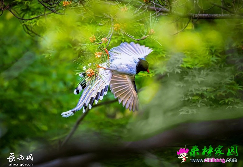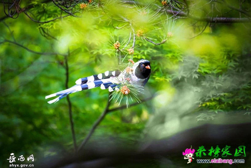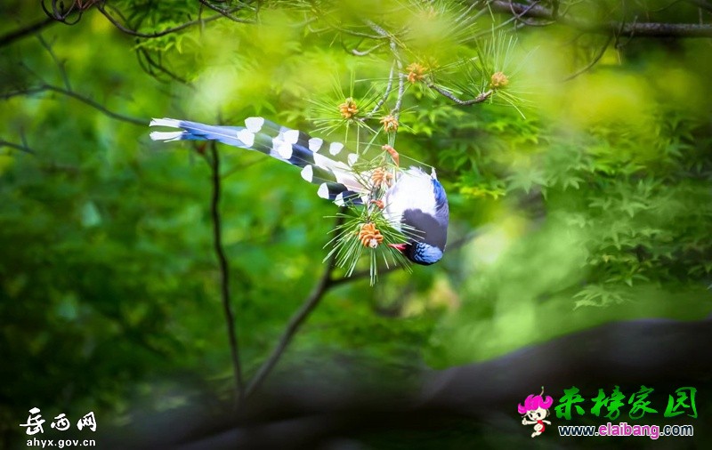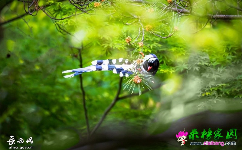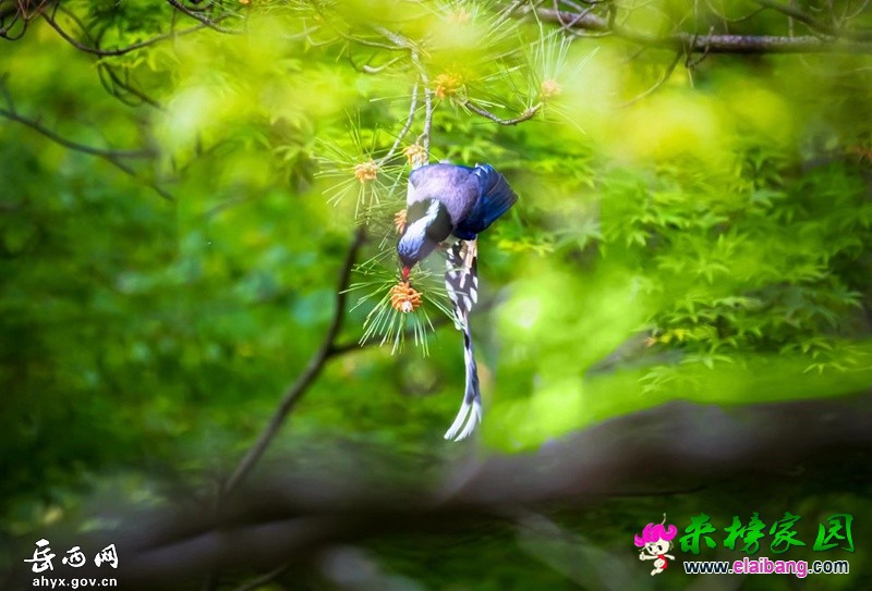 鹞落坪国家级自然保护区位于岳西县包家乡,林区总面积123平方公里,植被覆盖率高,物种丰富,且具有自然生态系统代表性。红嘴蓝鹊体长54至65厘米,嘴、脚呈红色,头、颈、喉和胸呈黑色,头顶至后颈有一块白色至淡蓝白色或紫灰色块斑,其余上体为紫蓝灰色或淡蓝灰褐色。