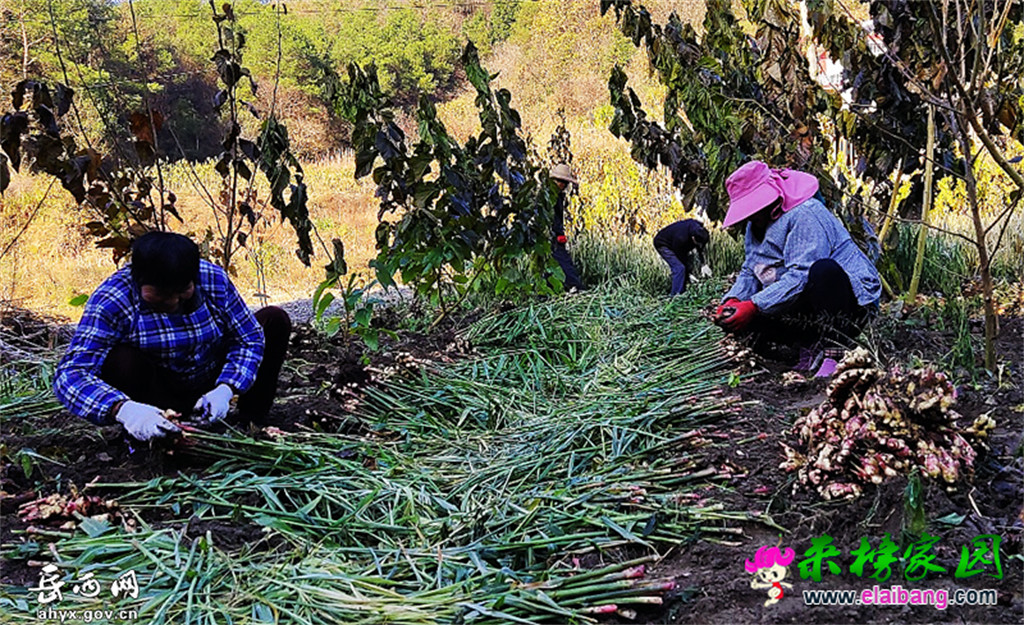 在来榜镇关河村,农民迎来一年一度的大丰收,玉米金黄饱满,生姜茎肥株壮,11月12日,趁晴好天气,农民们忙着在田间地头收获丰收的喜悦。