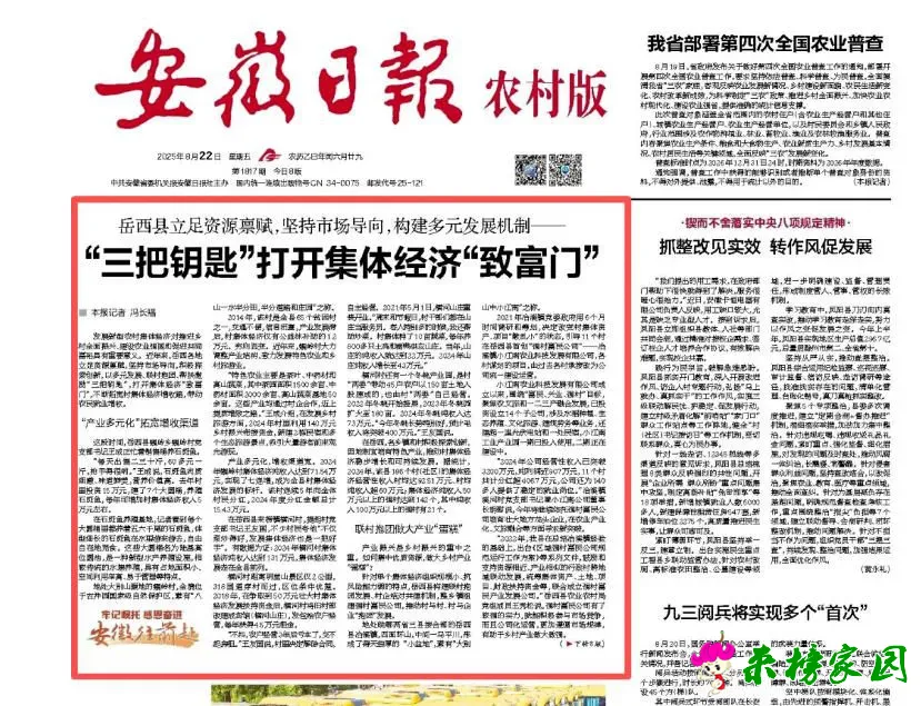 发展新型农村集体经济对推进乡村全面振兴、建设农业强国和促进共同富裕具有重要意义。近年来,岳西各地立足资源禀赋,坚持市场导向,积极探索创新,以多元发展、联村抱团、帮扶激励“三把钥匙”,打开集体经济“致富门”,不断拓宽村集体经济增收路,带动农民就业增收。 “产业多元化”拓宽增收渠道 这段时间,岳西县巍岭乡巍岭村党支部书记王成正忙着销售桶养石斑鱼。 “每天出售二三十斤,60多元一斤,抢手得很呐。”王成说,石斑鱼肉质细嫩、味道鲜美,营养价值高。去年村里投资15万元,建了7个大圆桶,养殖石斑鱼,每年可增加村集体经济收入5万元左右。 在石斑鱼养殖基地,记者看到每个大圆桶里都养着五六千尾的石斑鱼,体型细长的石斑鱼在水里游来游去,自由自在地觅食。这些大圆桶名为陆基高位圆池,是一种新型水产养殖设施,相较传统的水塘养殖,具有占地面积小、空间利用率高、易于管理等特点。 地处大别山腹地的巍岭村,全境位于古井园国家级自然保护区,素有“八山一水半分田,半分道路和庄园”之称。 2014年,该村是全县65个贫困村之一,交通不便,信息闭塞,产业发展滞后,村集体经济仅有公益林补助的1.2万元。穷则思变。近年来,巍岭村大力调整产业结构,致力发展特色农业和乡村旅游业。 “特色农业主要是茶叶、中药材和高山蔬菜,其中茶园面积1500余亩、中药材面积2000余亩、高山蔬菜基地50余亩。这些产业均通过村企合作,迈上提质增效之路。”王成介绍,在发展乡村旅游方面,2024年村里利用140万元乡村振兴衔接资金,新建2栋民宿和多个生态旅游景点,吸引大量游客前来观光游玩。 产业多元化,增收渠道宽。2024年巍岭村集体经济纯收入达到71.54万元,实现了七连增,成为全县村集体经济发展的标杆。该村连续5年向全体村民分红,2024年度分红金额总计15.43万元。 在岳西县来榜镇横河村,提起村党支部书记王友国,不少村民夸他“不仅菜炒得好,发展集体经济也是一把好手”。有数据为证:2024年横河村集体经济纯收入达到131万元,集体经济发展走在全县前列。 横河村距离明堂山景区仅2公里,318国道穿村而过,区位条件优越。2018年,在争取到50万元壮大村集体经济发展扶持资金后,横河村将旧村部改建成宾馆(横河山庄),发包给农户经营,每年获得4.5万元租金。 “不料,农户经营3年后亏本了,交不起房租。”王友国说,村里决定解除合同,自主经营。2021年5月1日,横河山庄重装开业。“周末和节假日,村干部们都在山庄当服务员。客人特别多的时候,我还帮助炒菜。村集体种了10亩蔬菜,每年养800多只土鸡和番鸭供应山庄。当年,山庄的纯收入就达到22万元。2024年山庄纯收入增长至43万元。” 横河村还有一个冬桃产业园,是村“两委”带动45户农户以150亩土地入股建成的,也由村“两委”自己经营。2022年冬桃开始挂果,2023年冬桃园扩大至180亩。2024年冬桃纯收入达73万元。“今年冬桃长势特别好,预计毛收入将突破400万元。”王友国说。 在岳西,各乡镇和村积极探索创新,因地制宜培育特色产业,推动村集体经济稳步增长和可持续发展。据统计,2024年,该县186个村(社区)的集体经济经营性收入村均达92.51万元、村均纯收入超60万元;集体经济纯收入50万元以上的强村达到142个,其中纯收入100万元以上的强村有21个。 联村抱团 做大产业“蛋糕” 产业振兴是乡村振兴的重中之重。如何集中优质资源,做大乡村产业“蛋糕”? 针对单个集体经济组织规模小、抗风险能力弱的特点,岳西县构建联村抱团发展、村企结对共建机制,整乡镇组建强村富民公司,推动村与村、村与企业“抱团”发展。 地处皖鄂两省三县接合部的岳西县冶溪镇,四面环山,中间一马平川,形成了得天独厚的 “小盆地”,素有“大别山中小江南”之称。 2021年冶溪镇党委政府用6个月时间调研和筹划,决定改变村集体资产、项目“散乱小”的状态,引导11个村在岳西县首创“强村富民公司”——冶溪镇小江南农业科技发展有限公司,各村谋划的项目,由过去各村承接改为公司统一建设运营。 小江南农业科技发展有限公司成立以来,围绕“富民、兴业、强村”目标,聚焦农文旅和一二三产融合发展,已投资设立14个子公司,涉及水稻种植、生态养殖、文化旅游、建筑劳务等业务,还建起一座光伏电站和一处民宿,小江南工业产业园一期已投入使用,二期正在建设中。 “2024年公司经营性收入已突破3200万元,纯利润近907万元,11个村共计分红超406.7万元,公司还为140多人提供了稳定的就业岗位。”冶溪镇溪河村党支部书记兼小江南公司董事长胡慰说,今年将继续依托强村富民公司培育壮大地方龙头企业,在农业产业化、文旅融合等方面寻求新突破。 “2022年,我县在总结冶溪镇经验的基础上,出台《区域强村富民公司规范运行工作方案》等系列文件,鼓励和支持资源相近、产业相似的行政村跨地域联动发展,统筹集体资产、土地、项目、财政扶持资金等,联合成立强村富民产业发展公司。”岳西县农业农村局党组成员王秀松说,强村富民公司有了较强的实力,就能积极参与市场竞争,而且公司化运营,更加遵循市场规律,有助于乡村产业做大做强。 据了解,目前岳西县24个乡镇全部注册成立了“强村富民公司”,累计注册资金1.479亿元。2024年,全县24个“强村富民公司”营业收入5753.1万元,营业利润2276.48万元。 帮