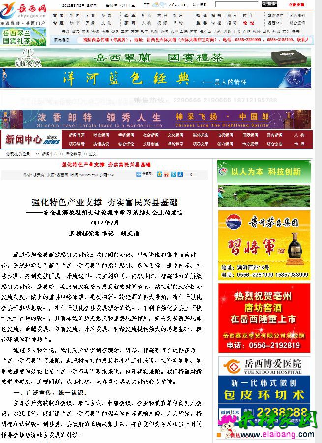 网址: 强化特色产业支撑 夯实富民兴县基础 -----在全县解放思想大讨论集中学习总结大会上的发言 2012年7月 来榜镇党委书记 胡天南 通过参加全县解放思想大讨论三天时间的会议、报告讲座和集中座谈讨论,系统地学习了解了“四个示范县”的指导思想、总体目标、建设内容、方法步骤,感到受益匪浅。开展这样一次主题鲜明、内容具体、措施得力的解放思想大讨论,是县委、县政府站在岳西发展新的时间节点,站在新的经济社会发展高度,做出的重要战略部署,是吹响新一轮进军的伟大号角,有利于强化全县干群思想统一,有利于强化全县发展理念的统一,有利于强化全县上下快干大干行动的统一,具有深远的历史意义和重要现实作用,必将为岳西实现绿色发展、跨越发展、创新发展、开放发展、和谐发展提供强大的思想基础、舆论环境和精神动力。 通过学习和讨论,我们充分认识到在观念、思路、措施等方面还存在与“四个示范县”有差距,就来榜当前的发展和各项工作来说,在科学发展、发展的速度和效益上与“四个示范县”要求来说,也还存在差距。我们将面对新的形势要求,正视问题,认真剖析,认真贯彻落实大讨论会议精神。 一、广泛宣传,统一认识。 立即召开党政联席会议、职工会议、村组会议、企业和镇直单位负责人会议,加强宣传,使打造“四个示范县”的理念和内容家喻户晓,人人皆知,将思想和认识统一到县委、县政府的正确决策上来,并自觉作为今后相当长时间指导全镇经济社会发展的引领。 二、立足本身,查找问题 根据“打造四个示范、加速富民兴县”总体要求,迅速在全镇上下掀起解放思想大讨论热潮,要求广大干群敢于触及深层次的矛盾和问题,敢于找出制约发展的障碍性因素和与发展不相适应的思想和行为。在大讨论中做到“两看两找”,立足来榜看来榜,找特色,找优势,打基础;跳出来榜看来榜,找差距,找对策,明方向。使全镇上下进一步认识镇情,把握镇情,进一步理清思路,在解放思想中统一思想,在解放思想中破解难题,在解放思想中实现新的更大发展。在发展理念上,坚持以科学发展为第一追求,以扶贫开发为中心任务,走生态文明发展之路,走绿色发展之路,大力发展生态农业、生态工业、生态旅游业。在工作推动上,发扬敢于负责、敢于碰硬、敢于创新的“三敢”精神,敢于负责就是要敢于承担起历史性的责任,以积极务实的态度解决矛盾和问题;敢于碰硬就是遇到问题不躲着走,绕着走。敢于碰硬不是硬碰,不是蛮干,而是科学地干;敢于创新就是以改革的精神创造性地推动各项工作。 三、强化特色产业支撑,在实现“四个突破”中解放思想 “四个示范”的出发点和归宿是以人为本,富民兴县,幸福人民。“四个示范”如果没有特色产业发展的支撑,就是空中楼阁,发展生命力强的富民产业是解决农村、农业、农民一切问题和困难的基础和抓手。发展特色产业是希望,是出路。就来榜来说,实现“四个示范”目标,着力点在于把绿色特色产业做大做强,按照“人无我有,人有我优,人优我特,人特我大”的观念,努力实现四个突破。 一是在特色种植业上实现突破:在巩固提升“安徽蚕桑第一镇”基础上,尽快使年产200吨白丝厂建成投产,进行蚕丝系列用品和食用蚕蛹开发,实现桑产业精品化生产和产业化开发取得实质性进展。大胆探索,改变传统茶叶生产模式,在提高名茶制作基础上,争取实施茶花收购和深加工项目,改一季茶叶为二季以上茶叶采摘生产,进行秋茶批量生产。做好解决瓜蒌病虫害防治和土壤不适应问题,支持瓜蒌籽榨油项目的成果实验和技术转化。推动四季豆等农特产品走品牌销售、品质取胜、高端战略的路子,积极寻找与合肥、武汉、上海等城市“农超对接”、“农企对接”、“农区对接”的最佳途径和模式。 二是在特色养殖业上实现突破:做大做强“徽名山”牌黑色有机猪,尽快获得国家级地理标志保护品牌。全省最大的鲟鱼养殖基地进行高附加值加工探索和二次创业,对娃娃鱼规模养殖的制约和障碍开展调研分析,想方设法加大推进力度,尽快发展成新的经济增长点。 三是在特色生态工业上实现突破,组建专门班子、全力支持名山公司开展上市准备;稳定工艺品出口同时,开拓国内旅游纪念品市场,同时电子产品各项发明专利创造转化成生产力条件,已签协议的现代高科技物联网项目尽快建成达效。 四是在特色集镇美好乡村建设上实现突破,进行二轮修编,高起点富规划,加快路灯、灯饰、垃圾处理、卫生饮用水、集镇防洪等基础设施建设。融入以吃、购和休闲体验为元素的发展理念,拓宽视野,创造条件实施“吃在来榜”的旅游综合战略,既让已形成的特色产业延伸链条,提高效益,又更好地促进这些特色产业的发展,特色支柱产业的发展就会夯实富民兴镇经济基础,为跨越发展提供可能,从而有力推进将来榜建设成为一个特色鲜明、功能齐全、管理规范、文化休闲、富有活力、辐射带动作用明显的风情小镇。 在夯实绿色产业基础中,我们强力保护森林资源,以铁的手腕惩治破坏山林行为,从源头上保护水源,同时多方筹集资金对集镇、中心村庄进行垃圾收集转运及各种农村污染的综合治理,加大《中国乡村垃圾处理创意试验区》项目的争取衔接,打造一个山美水绿、村庄亮净的优美人居环境。 我们将提振精气