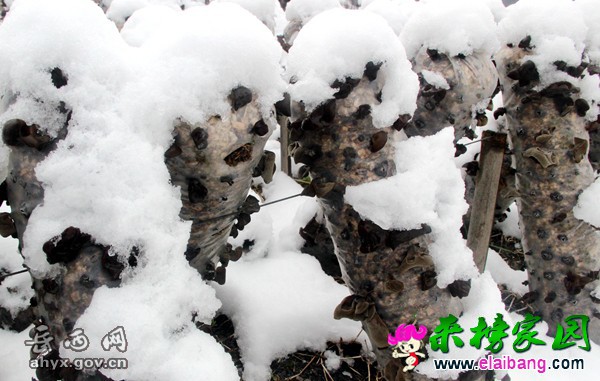 大棚内的桑枝香菇和大雪覆盖下的桑枝黑木耳充满勃勃生机。摄影 韩振球