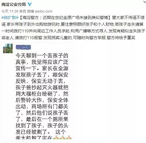 孩子在金源被偷遭剃头?北京海淀警方:未接到此类警情