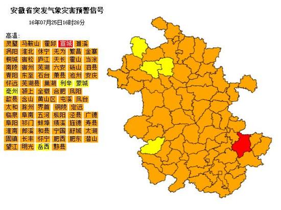 新安晚报 安徽网讯  记者从安徽省气象局官网获悉,全省高温警报持续拉响,温度数值居高不下,除了宣城出现高温红色预警,包括灵璧、马鞍山在内的全省70多个市县区出现高温橙色预警。